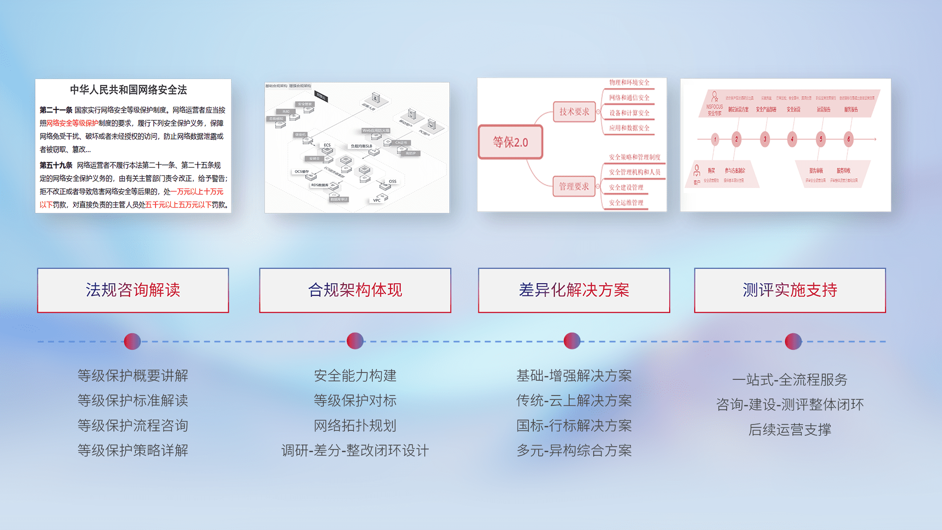通过专业的法律咨询解读、、、、合规架构体现、、、、差异化解决方案、、、测试实施支持等服务,,为客户量身打造等保合规体系。。